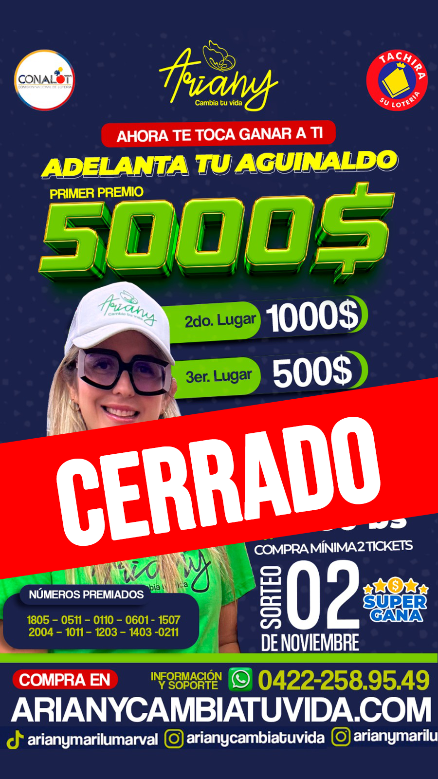 6. arianycambiatuvida.com se reserva la posibilidad de posponer la fecha del sorteo en el caso de que por motivos ajenos a nuestra voluntad no se alcance el 80% de los tickets vendidos, para que el usuario este informado se publicará permanentemente el porcentaje de tickets vendidos.